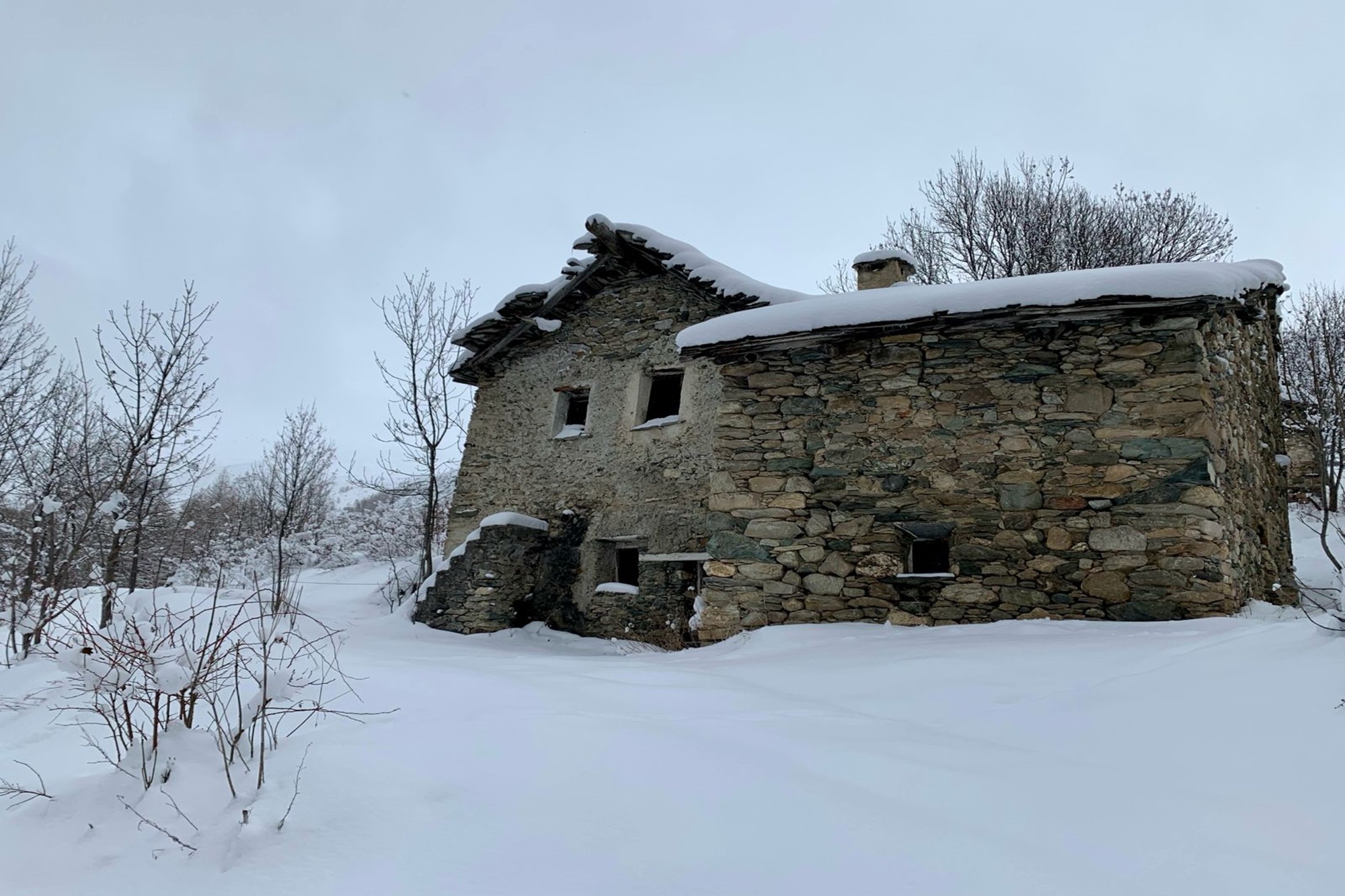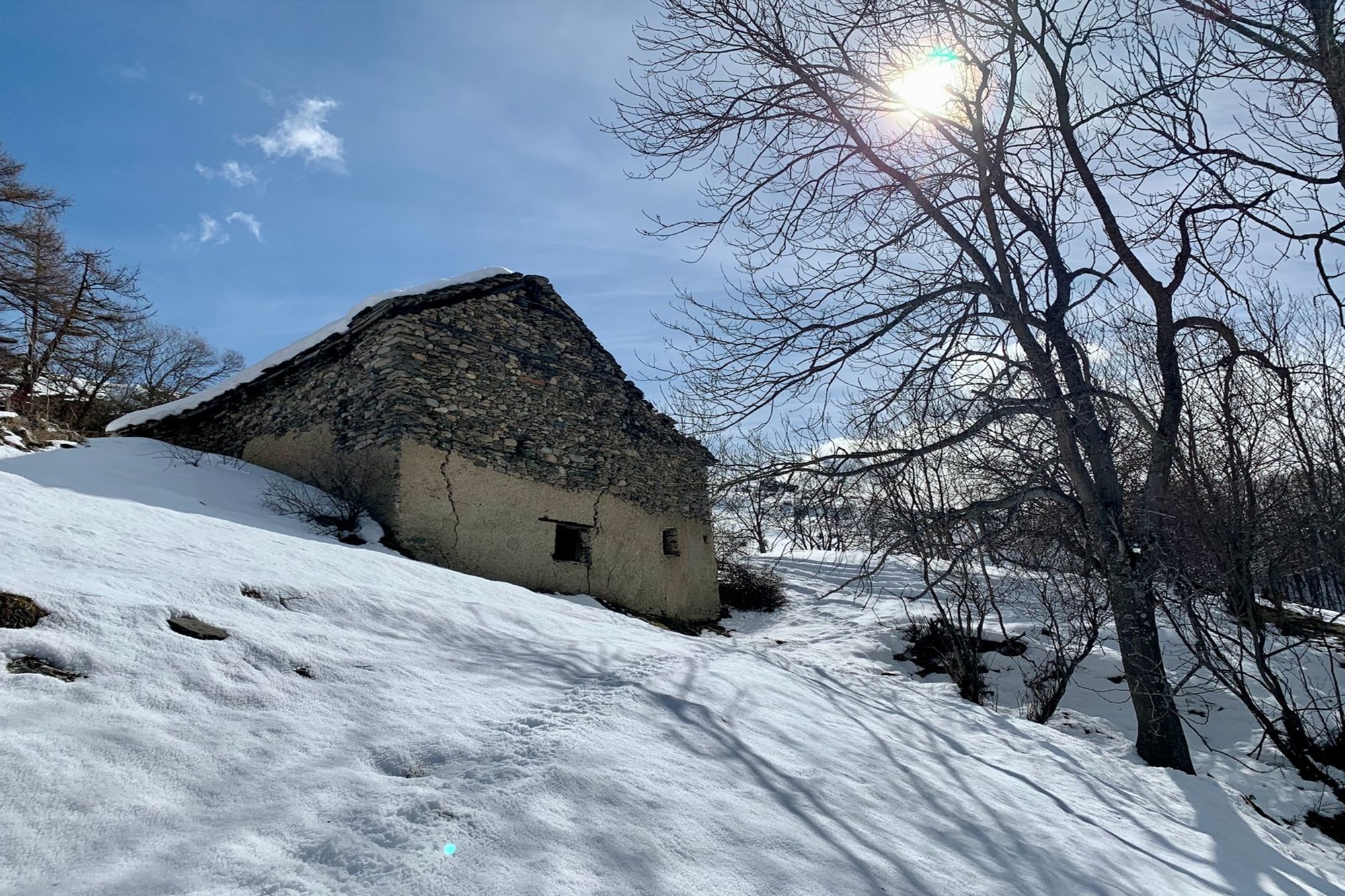 De là, tu suis la route qui remonte le vallon : il s’agit de la piste qui en été est normalement praticable en voiture, tandis qu’en hiver elle est fermée à la circulation. Même lorsque la route peut sembler dégagée de neige, il vaut mieux ne pas s’aventurer avec le véhicule, car plus haut se trouvent fréquemment des tronçons verglacés qui peuvent devenir dangereux.