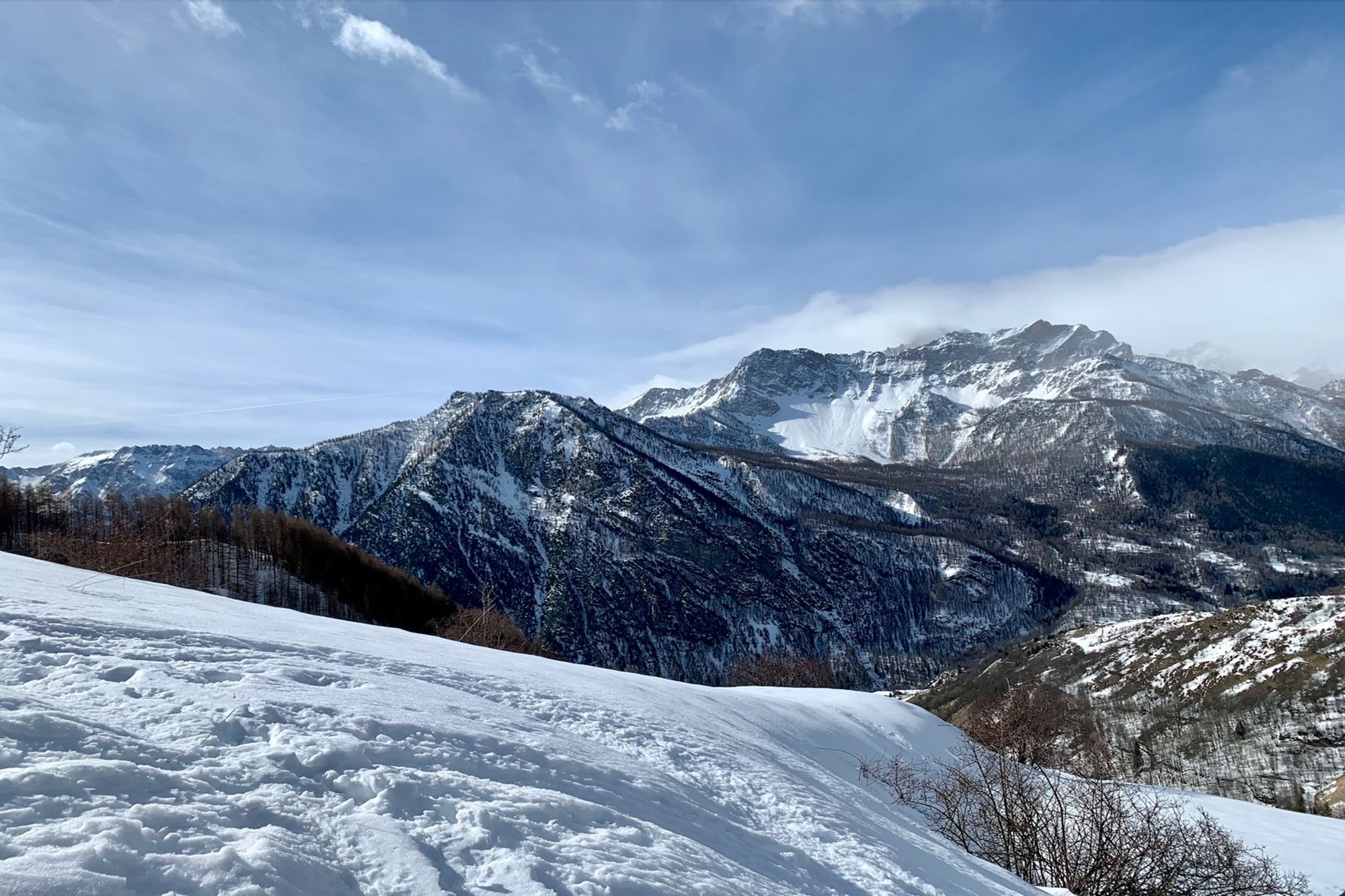 Depuis le sommet, le panorama est étonnamment vaste malgré la morphologie douce de la montagne : le regard s’étend sur toute la Valle Maira, distinguant clairement aussi bien les secteurs les plus bas et boisés que ceux de haute altitude. Vers le sud domine l’incontournable pyramide de la Rocca la Meja, tandis qu’en tournant le regard apparaissent les vastes dorsales du Monte Chersogno. Sur la crête opposée émerge proche et plus sévère le Monte Ruissas, tandis que tout autour se succèdent des pâturages ondulés et des vallons ouverts qui font du sommet un exceptionnel balcon panoramique, particulièrement gratifiant lors des limpides journées hivernales.