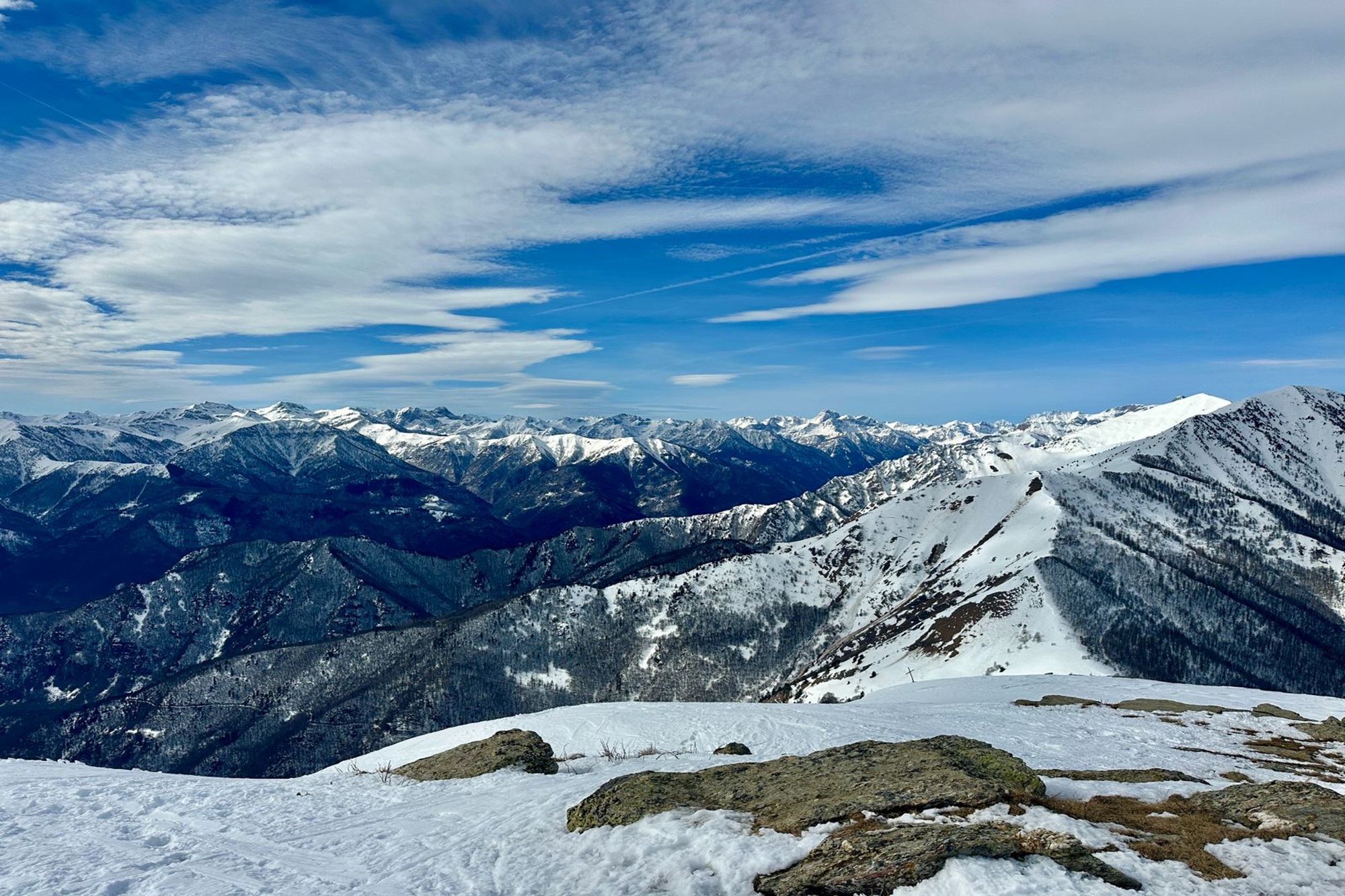 Depuis le sommet, le panorama est extraordinairement vaste et gratifiant. Vers le sud, la pyramide du Monviso domine la scène, sélevant isolée au-dessus de la chaîne alpine. À ses pieds, on distingue clairement les reliefs de la Val Varaita et les vallons latéraux, tandis quen tournant le regard vers louest, toute la Val Maira souvre avec la succession de crêtes et de montagnes qui ferment lhorizon. Par temps clair, le regard porte loin sur une vaste partie des Alpes Cottiennes, avec des forêts, des vallons enneigés et de petits villages qui ponctuent le fond de la vallée. La position isolée de la montagne fait de ce sommet lun des balcons panoramiques les plus suggestifs de la zone.
